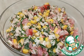 У меня салатик был не очень большой, потому хватило половинки баночки. Немного майонеза. -