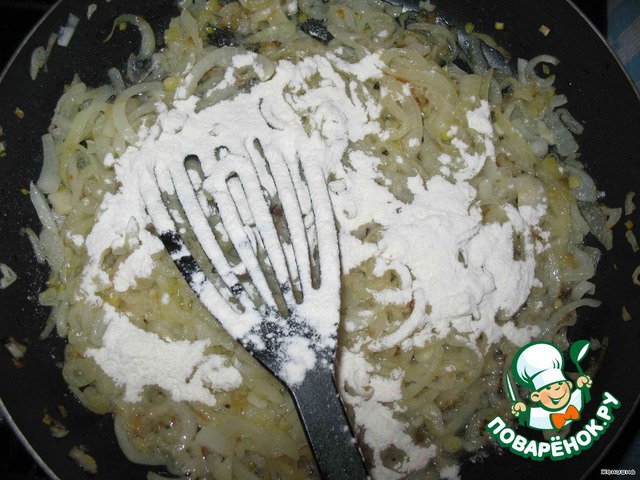 В обжаренный лук добавляем ложку муки, перемешиваем и обжариваем минуту-две