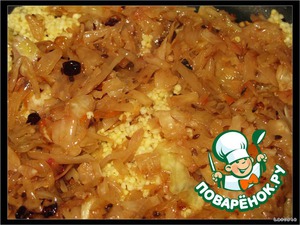 Квашеную капусту отжать, добавить к луку и тушить около 5-7 минут, затем переложить на отдельное блюдо.