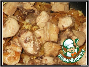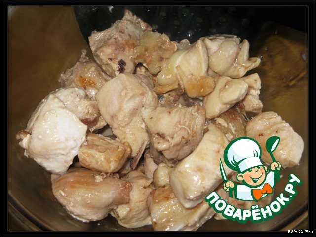 Куриную грудку нарезать крупными кусками, посолить и обжарить на растительном масле до золотистой корочки, затем выложить на отдельное блюдо.