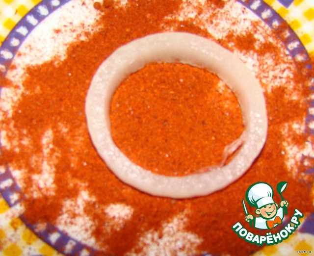 Затем паприку насыпать на блюдце и макаем кольцо в паприку
