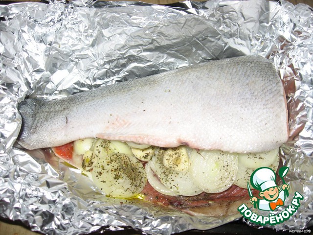 Cлегка сбрызнуть рыбу лимоном, выложить лук, дольки чеснока, можно посыпать травками (у меня прованские травы) и закрыть второй половинкой рыбы.