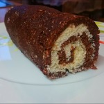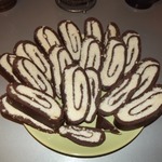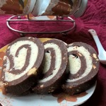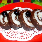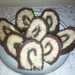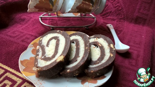 Сделать белый слой - смешать мягкое масло, кокосовую стружку и сахарную пудру. Распределить белый слой на шоколадном, закрутить в рулет и отправить в морозилку на полчаса.