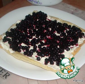 На выпеченный корж выложить половину крема, сверху распределить половину ягод, слегка посыпать сахарной пудрой.