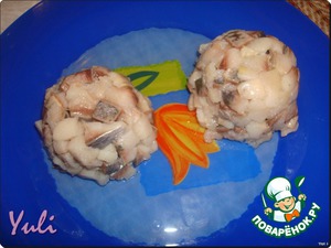 Белок мелко нарубить или натереть на мелкой терке. Полученной крошкой посыпать селедочный конус. -