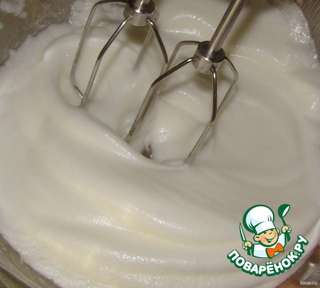 Тесто... Желтки растираем с сахаром до бела. Добавляем муку. Отдельно взбиваем в крутую пену белки, соединяем с тестом, хорошо перемешиваем. Тесто выливаем на противень, смазанный маслом (если без антипригарного покрытия, то застелите пергаментной бумагой).