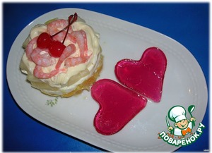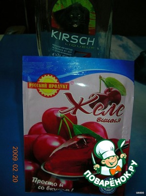 Сначала делаем желе. Можно взять замороженную вишню, отжать сок, добавить желатин, вишнёвый ликёр и сделать желе.