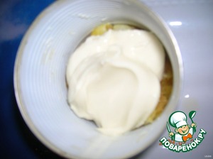 Далее укладываем ананасы из компота, намазываем майонезом.