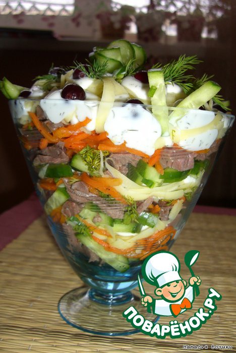 Верхний слой красиво украсить соусом, огурчиком и можно ягодками клюквы, зеленью, ну, как душа пожелает