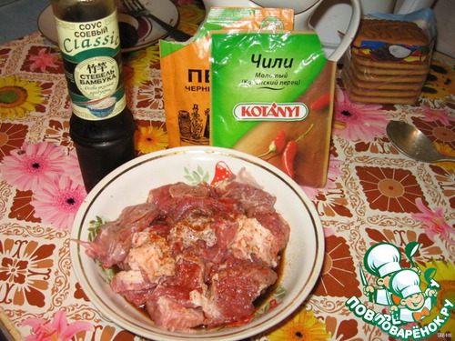 маринуем говядину в соевом соусе (по вкусу) с черным и красным перцем от 20 минут (чем дольше, тем вкуснее).