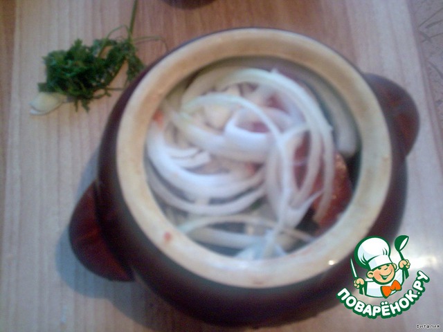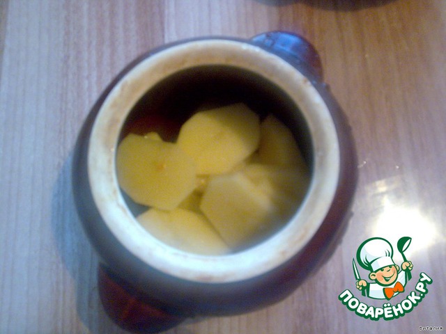 Картофель почистить, нарезать крупными кусками, выложить на дно горшочка из расчета 2 картофелины на 1 порцию (1 горшочек), посолить.