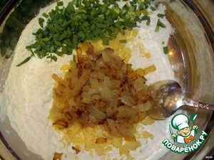 В емкости смешиваем блинную муку с простой, добавляем половину жареного лука, половину сыра и нарезанный зеленый лук, щепотку соли.