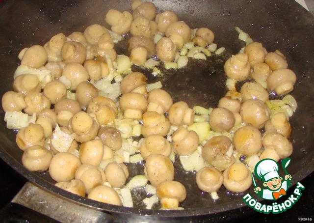 Шампиньоны обжариваем в растительном масле с луком и чесноком