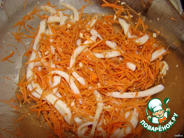 Смешиваем кальмары с морковью...