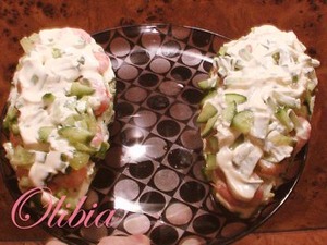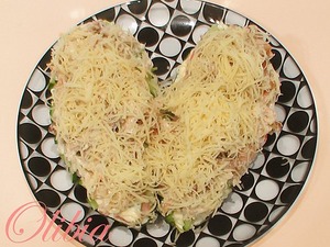 Наполняем половинки следующим, каждый слой смазываем майонезом: