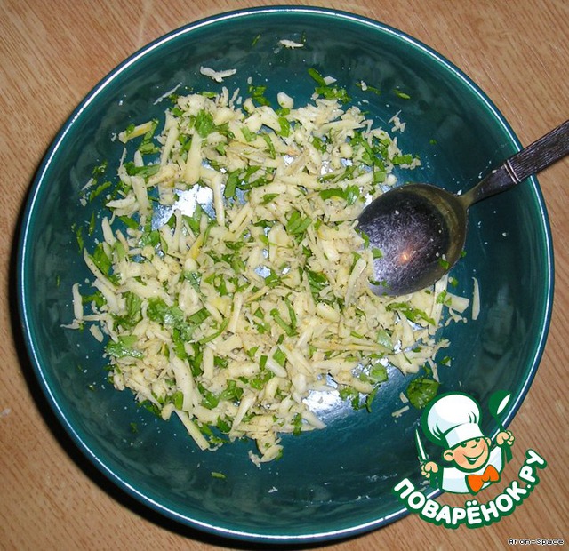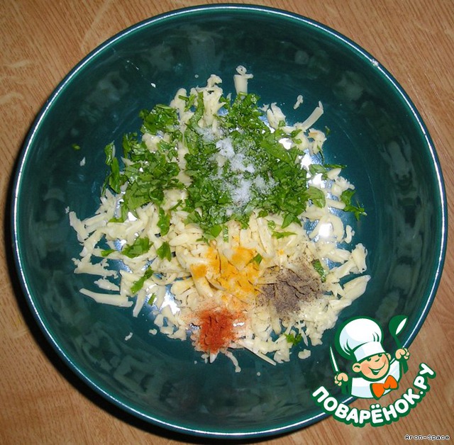 Натираем на тёрке сыр, добавляем чёрный перчик, куркуму, перчик "Чили", зелень и соль.