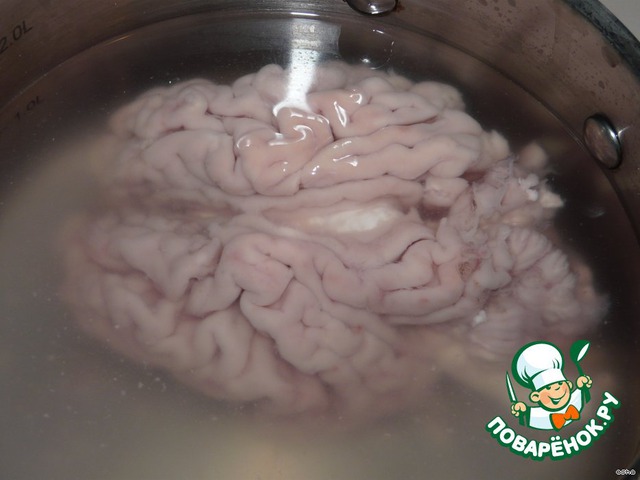 Отварить мозги 20 мин в бульоне из уксуса (100 г) + воды (400 г) или в вине белом или красном, добавив лук, морковь, чеснок, зерна перца, лавровый листик.