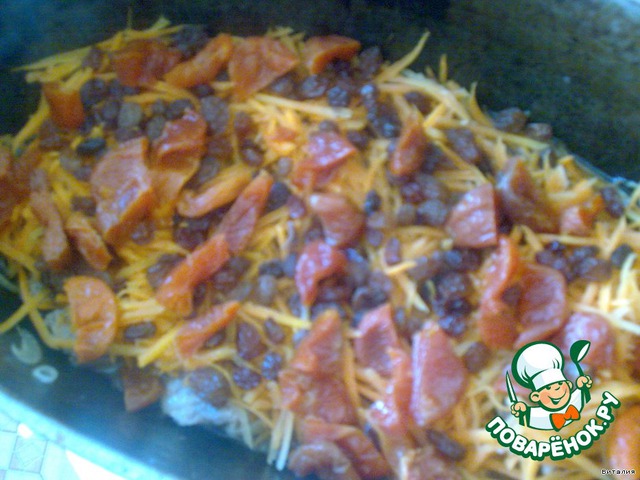 • На морковь выложить промытый изюм и курагу (я ее нарезала на кусочки), посыпать семенами зиры.