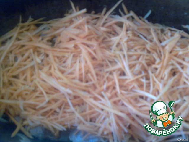 • Выложить морковь на мясо, не перемешивать, потомить под крышкой минут 5-7.