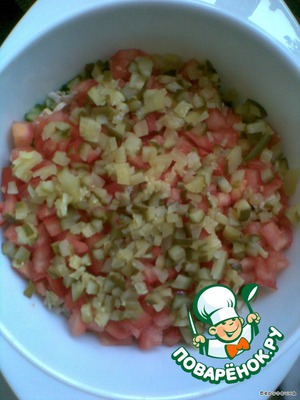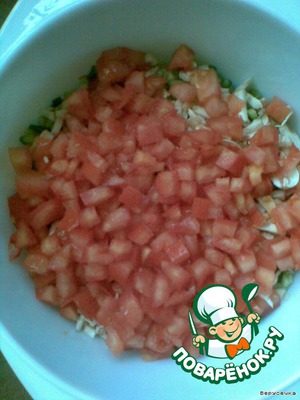 Помидорчик помыть, разрезать пополам и удалить семена.