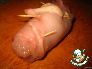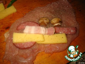 рулетики складываем в форму, заливаем сметаной (в нее добавляем чеснок), сверху грибы, потом натертый сыр и в духовку