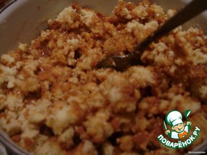 Первую смазать варeнкой, вторую - кремом (смешать творог с пудрой и нарезанной курагой), а третью часть покрошить в крошку и смешать с варeнкой.