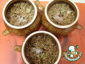 Закладываем гречку. В мои горшочки (3 штуки) ушло 2 стакана (то есть чуть больше половины стакана в каждый).