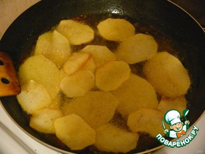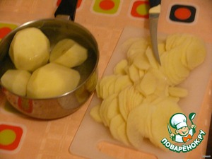 Картофель нарезать тонкими пластинками и обсушить.