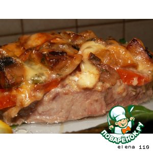 Помидоры порезать кружочками, положить по два кружка на каждый кусок мяса.