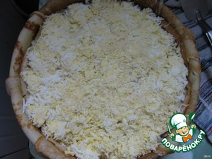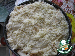 потом кладем третью начинку. делаем заливку. взиваем яйцо со сливками сметаной перцем и немного соли. выливаем на тертые яйца