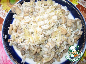 делаем вторую начинку. две луковицы нарезанные полукольцами обжариваем с грибами и специями. отвариваем рис и добавляем его к грибам.