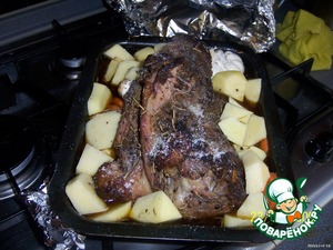 Пришла после "гулянки", порезала быстренько лук, морковь, картошку, все заложила к баранине, налила воды, сколько позволяла форма, накрыла фольгой и опять в духовку часа на два.