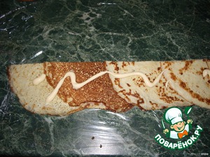 Блины режем на 2 половинки, укладываем в полоску с нахлестом один на другой.Смазываем для липкости майонезом.