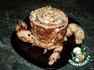 Выкладываем начинку на блины не очень толсто, и аккуратно скручиваем рулетик. Из еще одного блина скручиваем 2 маленьких рулетика - имитируем корни. Для корней пойдут и обрезки, и некондиция блинов;)
