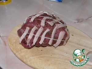 Кусок говядины очистить от пленок, натереть специями и солью и связать. Кусок нужно брать не менее 1,5 кг, а лучше больше... Связывают, чтобы пропекалась равномернее. Привязать полосочки сала.