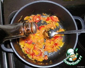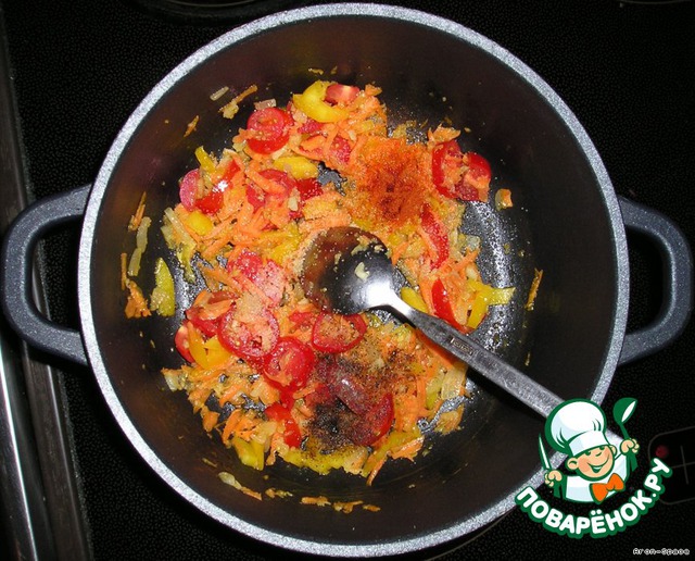 Высыпьте всё это дело в поджаренный до золотистого цвета лучок, имбирь и чесночок. Поперчите, посолите.