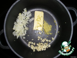 Возьмите сковороду с крышкой или кастрюлю с толстым дном, положите туда кусочек сливочного масла. Очистите кусочек имбиря (чистится, как обычный картофель), натрите его на мелкой тёрке и положите в сковордку.