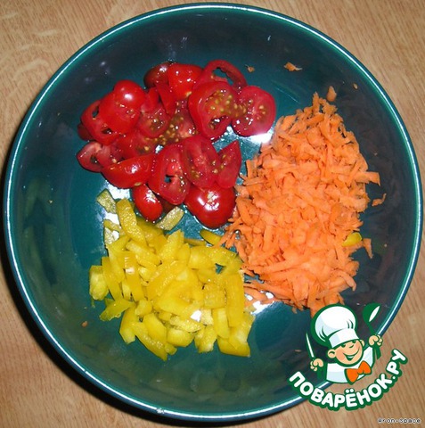 Порежьте свежий перчик, помидорку и натрите на крупной тёрке морковь.
