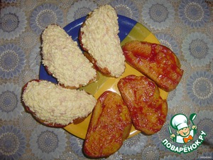 Обжаренные ломтики батона слегка смазать кетчупом и выложить на них творожную массу.