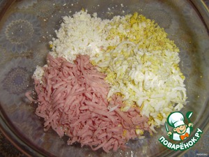 Смешать творог, тертые на терке колбасу и яйца.