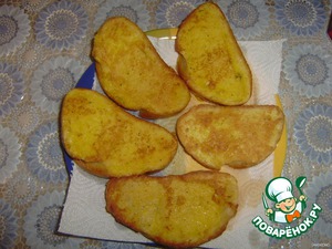 Затем ломтики батона обмакнуть в яйцо и обжарить в небольшом количестве масла, выложить их на салфетку. -