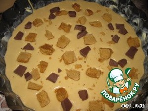 • У меня остались ириски и немного шоколада. Поэтому я решила вылить половину теста, добавить ириски и шоколад.