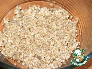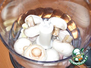 300 г шампиньонов очистить и вместе с луком и чесноком измельчить кухонным комбайном.