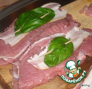 Накрыть каждый кусочек телятины ломтиком ветчины, сверху уложить по листику шалфея, но у меня шалфея не было, я заменила свежим базиликом. Закрепить зубочистками.