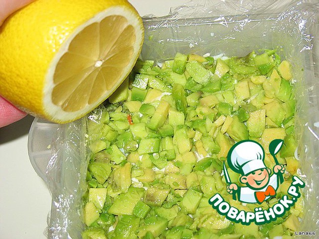 Третий слой - авокадо. Разрезать пополам, мякоть нарезать на кубики. Сбрызнуть соком лимона и смазать майонезом.