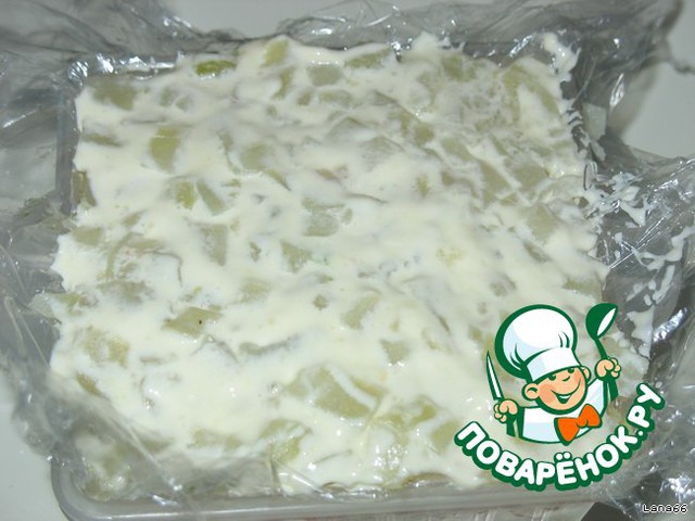 Застилаем форму пищевой пленкой так, чтобы концы пленки торчали. Это для того, чтобы потом было удобно вынимать салат на тарелку.