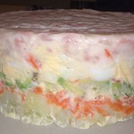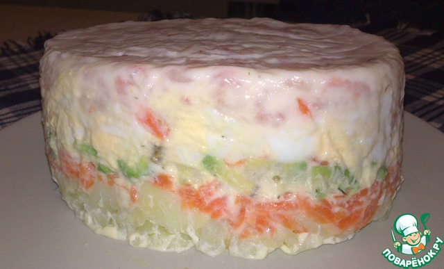 Четвёртый слой - вареная морковь. Нарезать на кубики и смазать майонезом. При этом не забывая посолить.