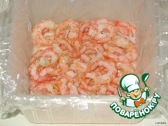 Теперь укладываем на дно формы очищенные креветки, смазываем майонезом. Это будет первый слой. Старайтесь укладывать креветки спинками к стенке контейнера.