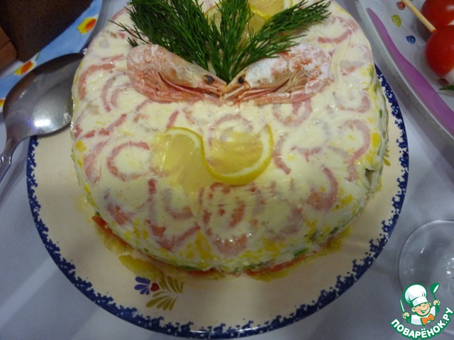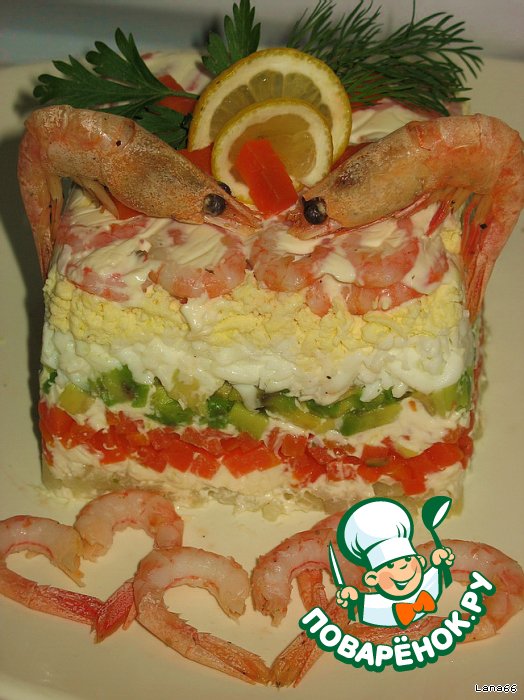 Верхушку я украсила ломтиком лимона, креветками и зеленью.