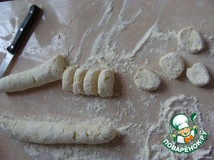 Нарезаем кусочками, примерно толщиной в 1 см. Каждый кусочек обваливаем в муке. -